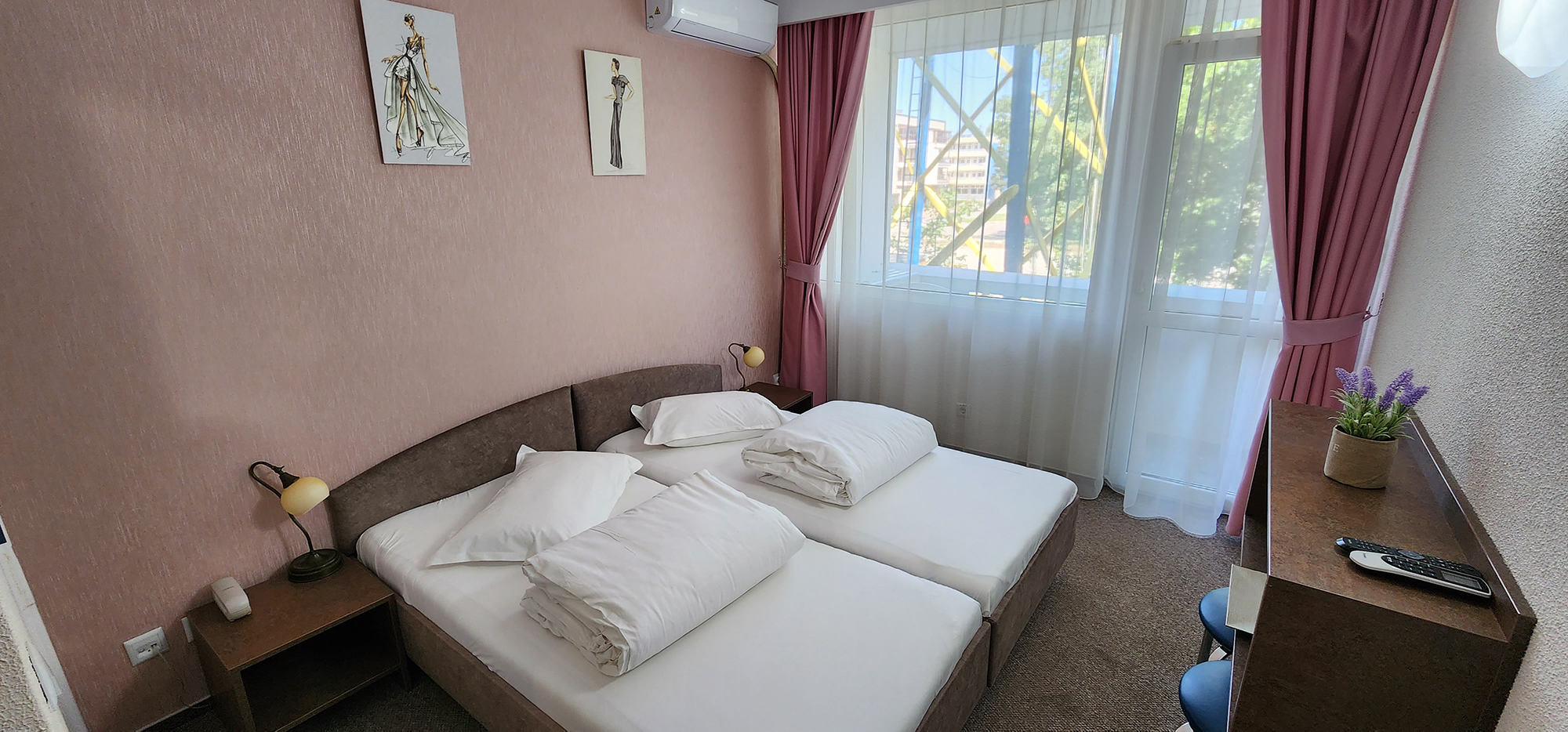 Camera dublă economy - situata la parter și la etajul 1 orientată către nord. Acest tip de camera are vedere către clădirea din vecinătate si dispune de balcon (dotat cu o măsuța și 2 scaune) potrivit pentru un moment de respiro la malul mării .